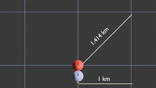 Elle s'éloigne toujours du vaisseau rouge, verticalement, à la vitesse de 1 kilomètre par seconde, mais elle s'éloigne du vaisseau bleu, en diagonale, à la vitesse de 1.414 kilomètres par seconde. Tout ça est conforme aux principes de la relativité galiléenne.