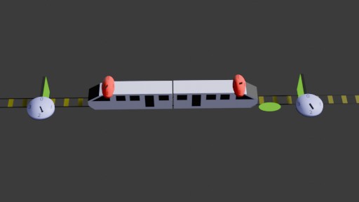 - Des horloges bleues dans le référentiel du tunnel, qui se déplace en même temps que le tunnel (du point de vue du train).
