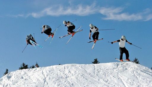 Autrement dit, ce qui est montré dans le référentiel du haut ressemble à l'image ci-dessous, lorsque le paysage est immobile et que le sportif est montré à différents instants, alors que ce qui est en bas, ressemblerait à une photo ou il y aurait une seule image du skieur, mais plusieurs images du paysage, prises à ces instants différents.