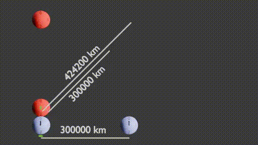 Il faut attendre 1.414 secondes aux horloges du référentiel bleu pour que la lumière ait parcouru toute la diagonale soit 424200 km.